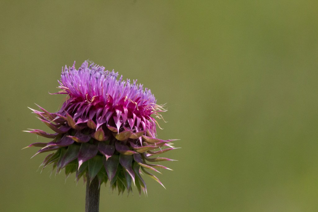 A thistle plant’s flower/An annoying weed still produces a glimpse of beauty