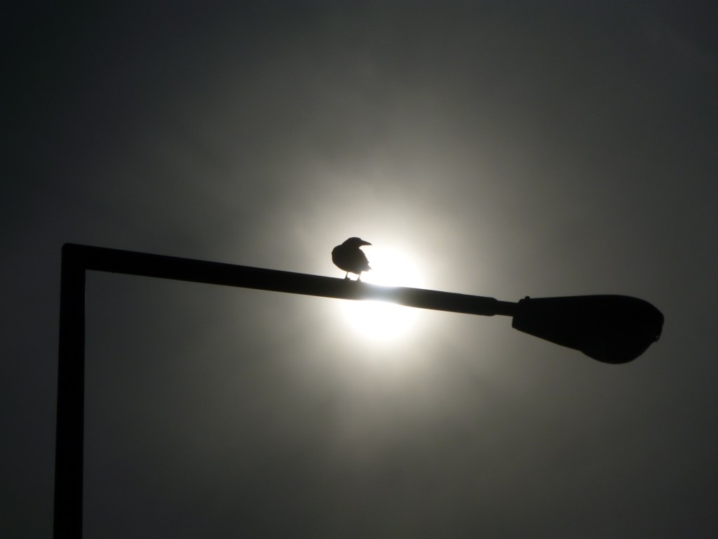 A bird on a lamp post/A sliver of eternity pierces a cloudy day